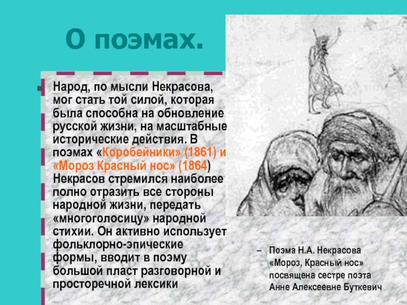 способна на обновление русской жизни, на масштабные исторические действия. В поэмах «Коробейники» (1861) и «Мороз Красный нос» (1864) Некрасов стремился наиболее полно отразить все стороны народной жизни, передать «многоголосицу» народной стихии. Он активно использует фольклорно-эпические формы, вводит в поэму большой пласт разговорной и просторечной лексики