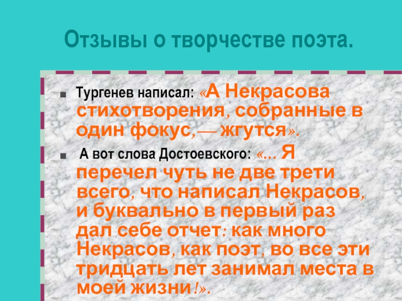 А вот слова Достоевского: «... Я перечел чуть не две трети всего, что написал Некрасов, и буквально в первый раз дал себе отчет: как много Некрасов, как поэт, во все эти тридцать лет занимал места в моей жизни!».