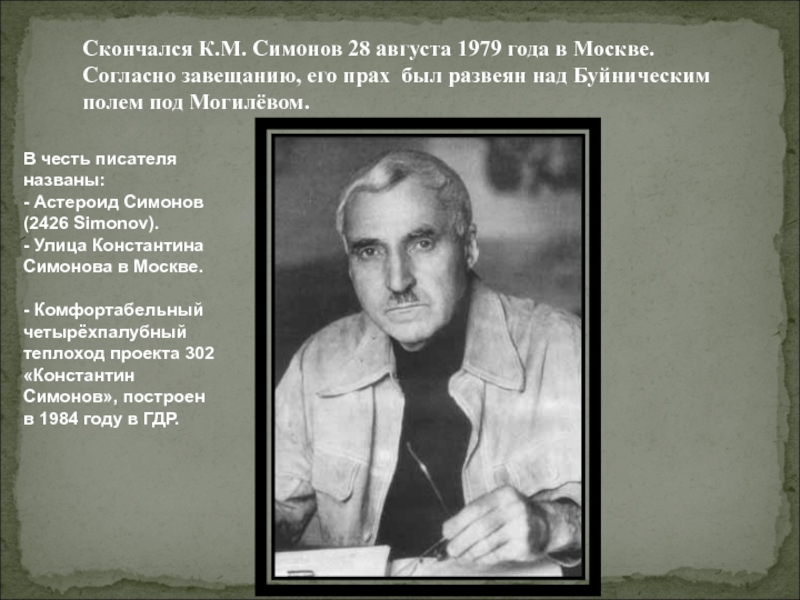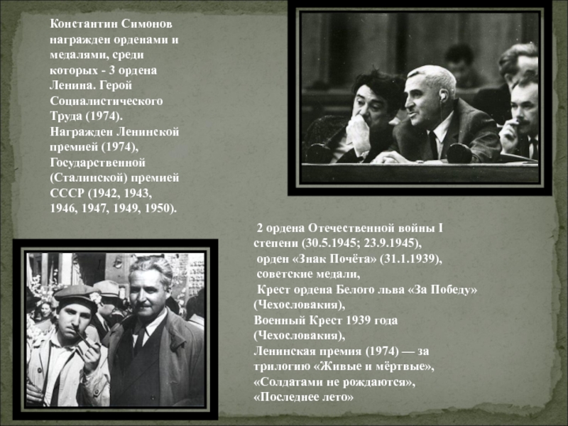 Ленинская премия (1974) — за трилогию «Живые и мёртвые», «Солдатами не рождаются», «Последнее лето»