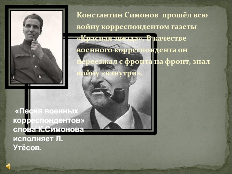 «Песня военных корреспондентов» слова К.Симонова исполняет Л.Утёсов.