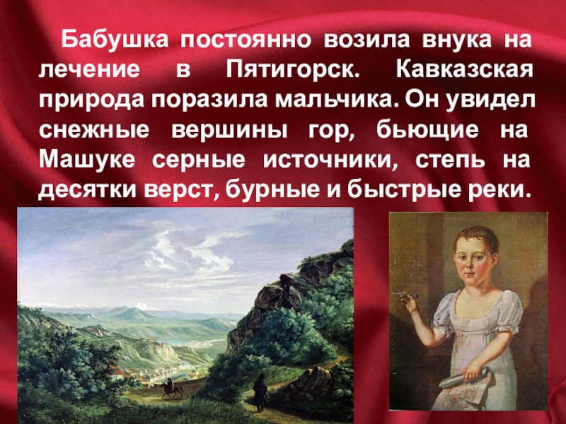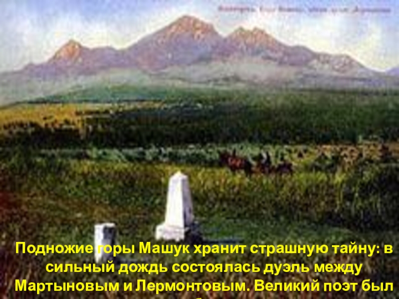 Подножие горы Машук хранит страшную тайну: в сильный дождь состоялась дуэль между Мартыновым и Лермонтовым. Великий поэт был убит.