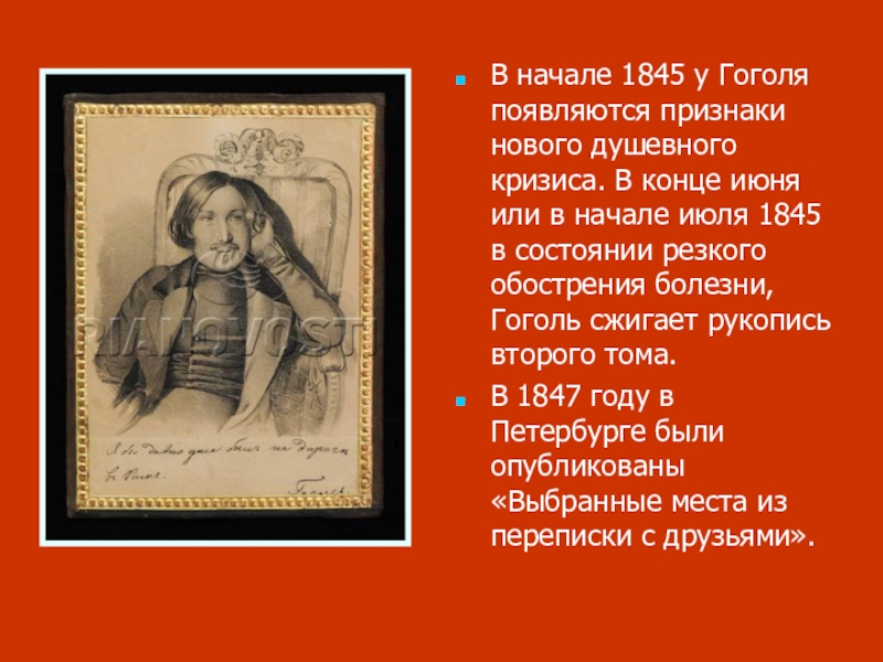 Слайд 19В начале 1845 у Гоголя появляются признаки нового душевного кризиса. В