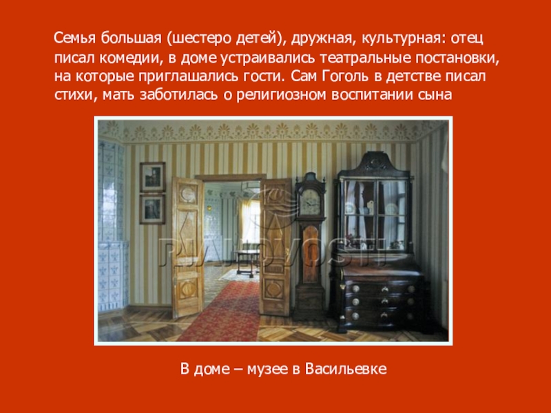 в доме устраивались театральные постановки, на которые приглашались гости. Сам Гоголь в детстве писал стихи, мать заботилась о религиозном воспитании сына