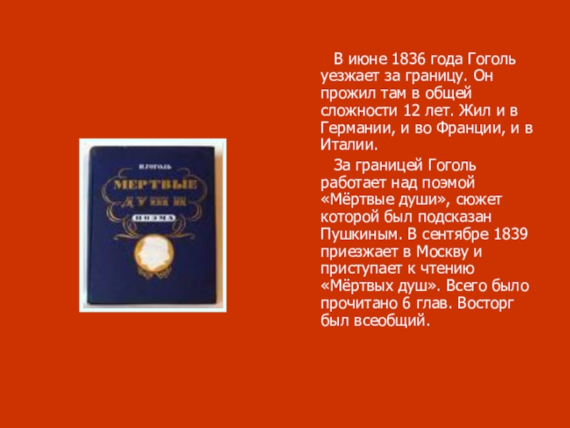 За границей Гоголь работает над поэмой «Мёртвые души», сюжет которой был подсказан Пушкиным. В сентябре 1839 приезжает в Москву и приступает к чтению «Мёртвых душ». Всего было прочитано 6 глав. Восторг был всеобщий.