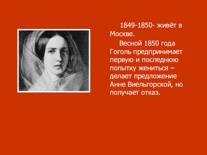Весной 1850 года Гоголь предпринимает первую и последнюю попытку жениться – делает предложение Анне Виельгорской, но получает отказ.