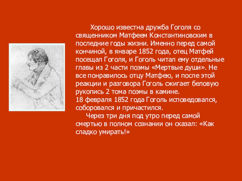 Константиновским в последние годы жизни. Именно перед самой кончиной, в январе 1852 года, отец Матфей посещал Гоголя, и Гоголь читал ему отдельные главы из 2 части поэмы «Мертвые души». Не все понравилось отцу Матфею, и после этой реакции и разговора Гоголь сжигает беловую рукопись 2 тома поэмы в камине.