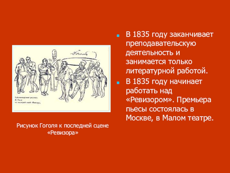 1835 году начинает работать над «Ревизором». Премьера пьесы состоялась в Москве, в Малом театре.