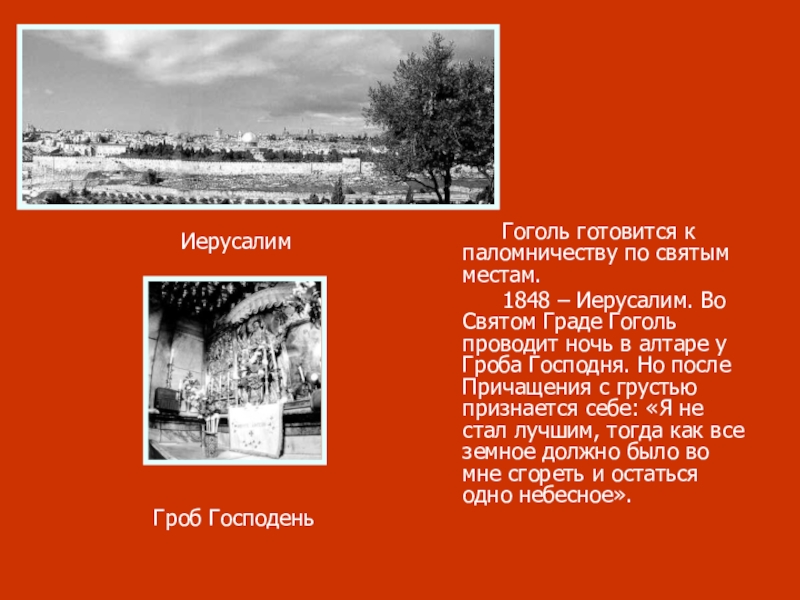 1848 – Иерусалим. Во Святом Граде Гоголь проводит ночь в алтаре у Гроба Господня. Но после Причащения с грустью признается себе: «Я не стал лучшим, тогда как все земное должно было во мне сгореть и остаться одно небесное».