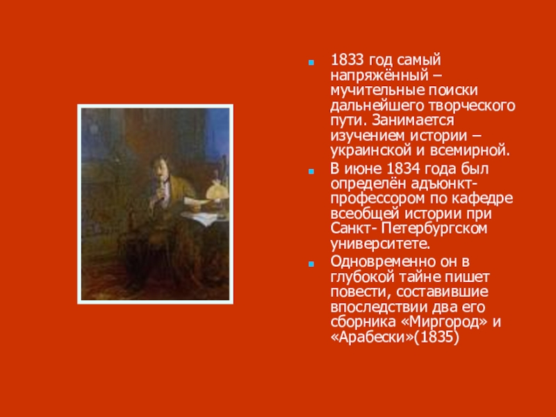 Одновременно он в глубокой тайне пишет повести, составившие впоследствии два его сборника «Миргород» и «Арабески»(1835)