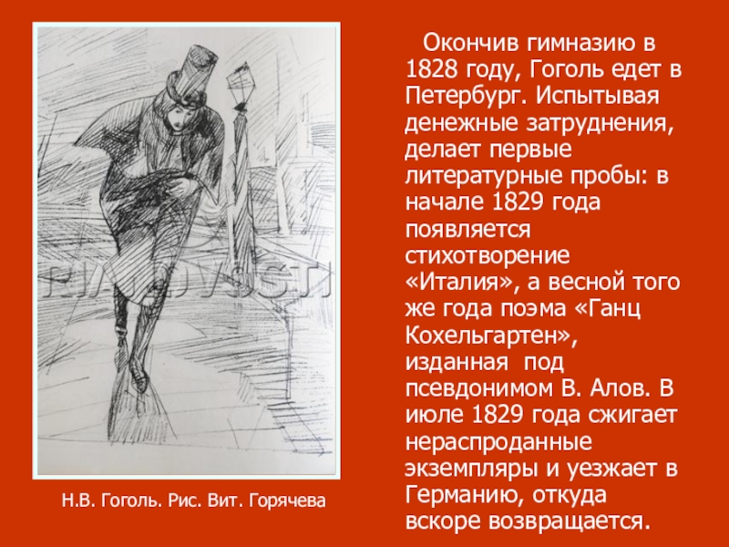 Слайд 11 Окончив гимназию в 1828 году, Гоголь едет в
