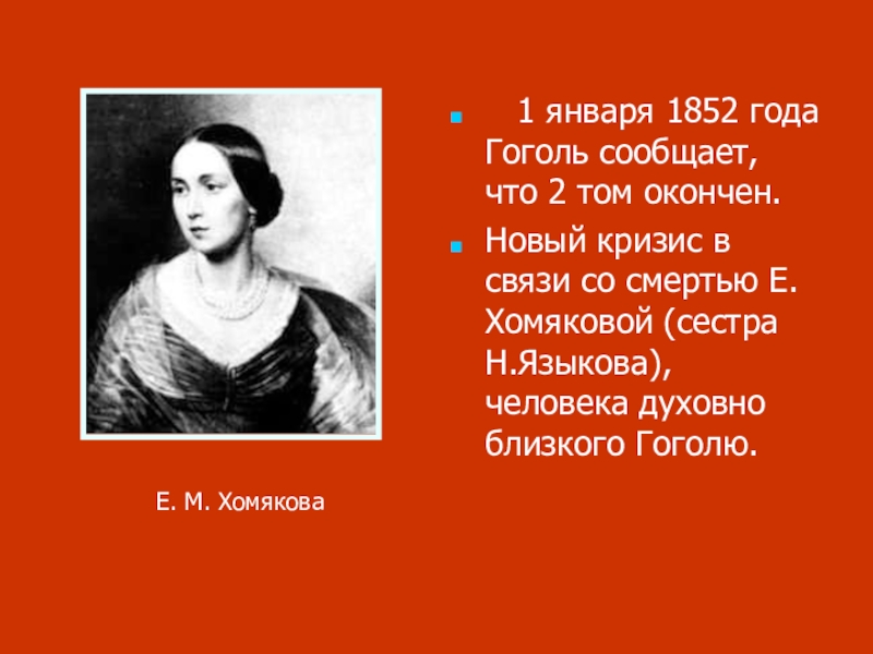 Новый кризис в связи со смертью Е.Хомяковой (сестра Н.Языкова), человека духовно близкого Гоголю.