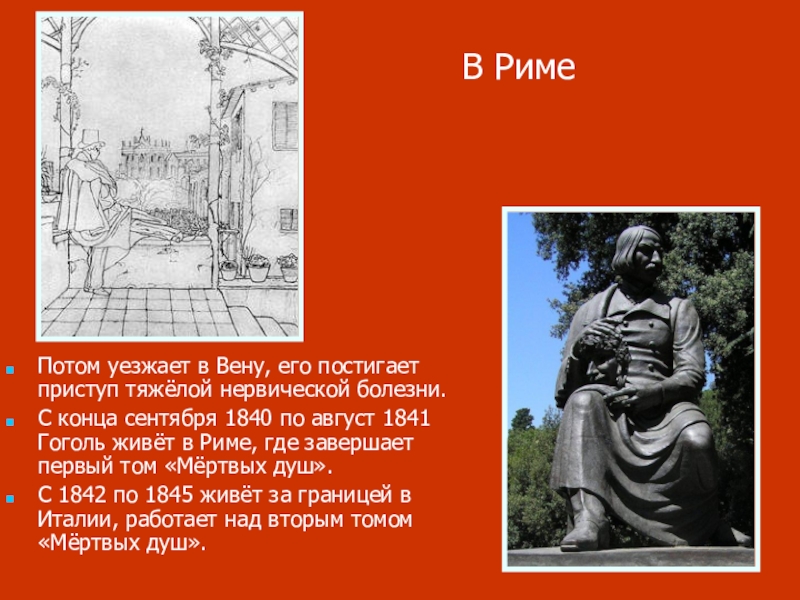 сентября 1840 по август 1841 Гоголь живёт в Риме, где завершает первый том «Мёртвых душ».