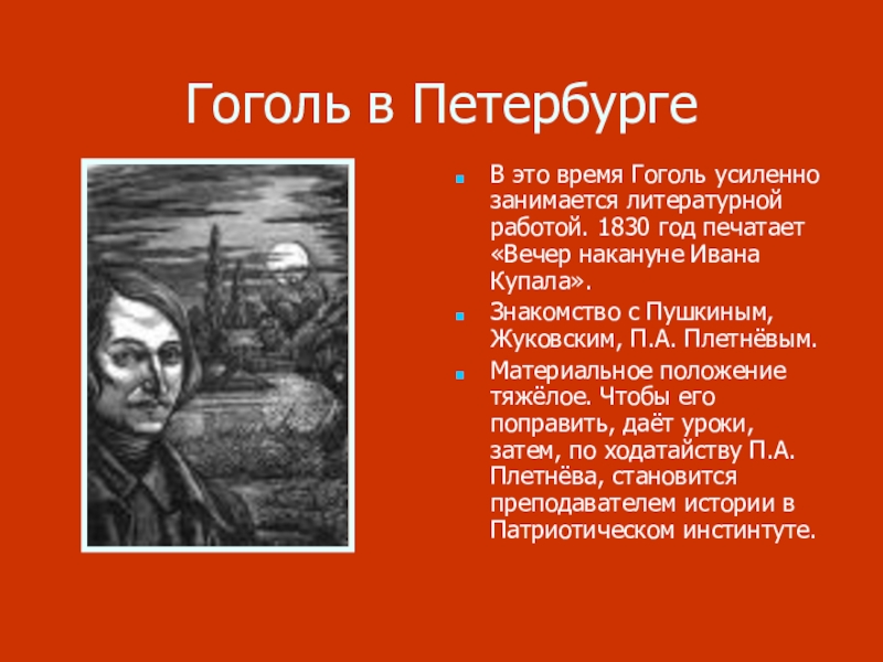 В это время Гоголь усиленно занимается литературной работой. 1830