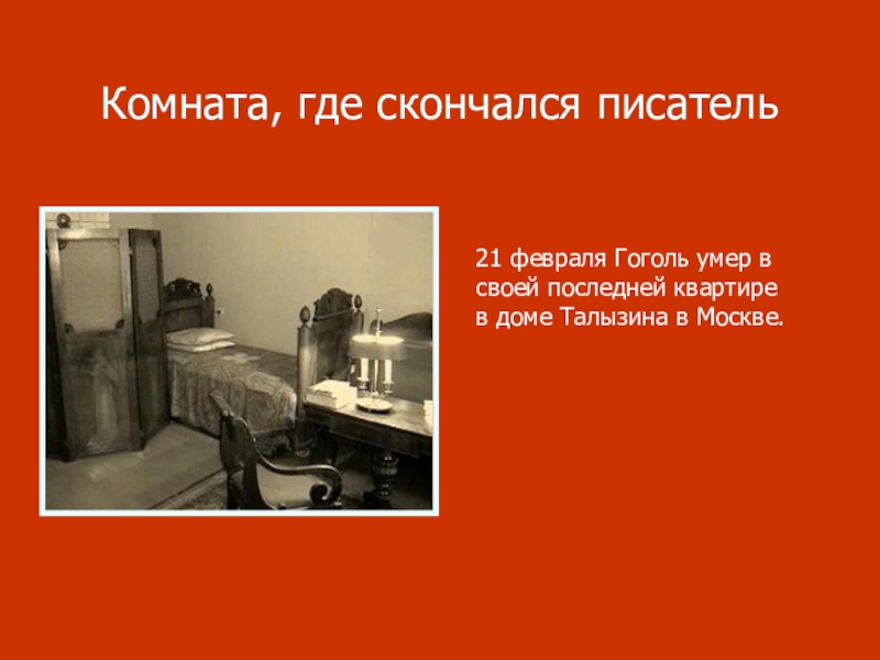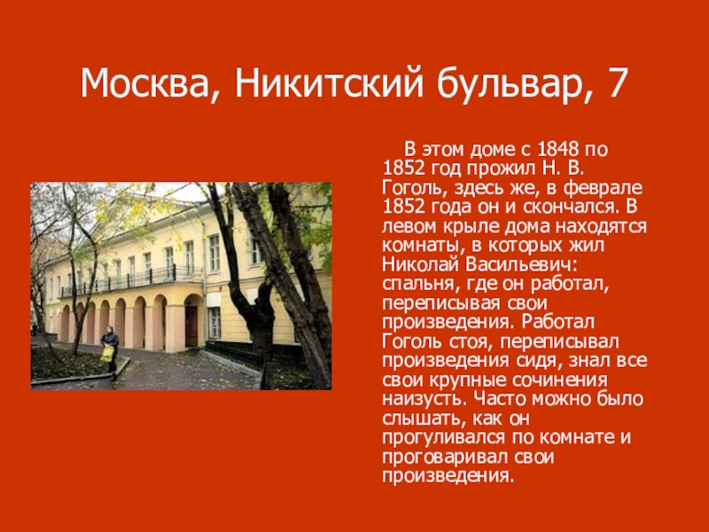 1848 по 1852 год прожил Н. В. Гоголь, здесь же, в феврале 1852 года он и скончался. В левом крыле дома находятся комнаты, в которых жил Николай Васильевич: спальня, где он работал, переписывая свои произведения. Работал Гоголь стоя, переписывал произведения сидя, знал все свои крупные сочинения наизусть. Часто можно было слышать, как он прогуливался по комнате и проговаривал свои произведения.