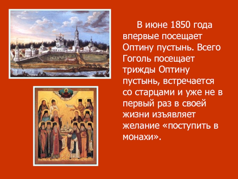 пустынь. Всего Гоголь посещает трижды Оптину пустынь, встречается со старцами и уже не в первый раз в своей жизни изъявляет желание «поступить в монахи».