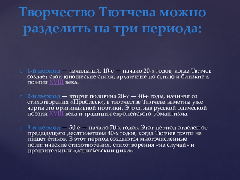 Творчество Тютчева можно разделить на три периода: