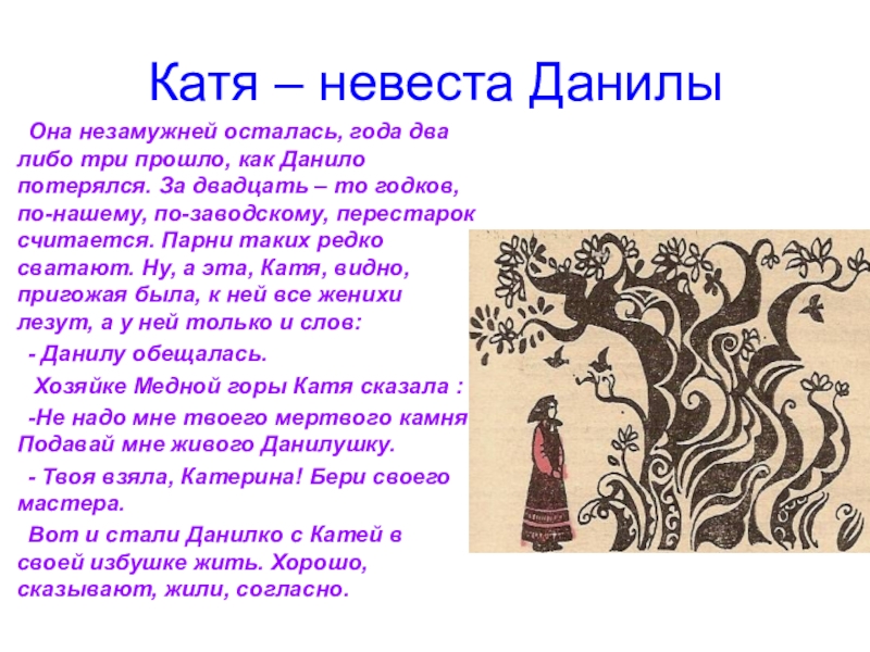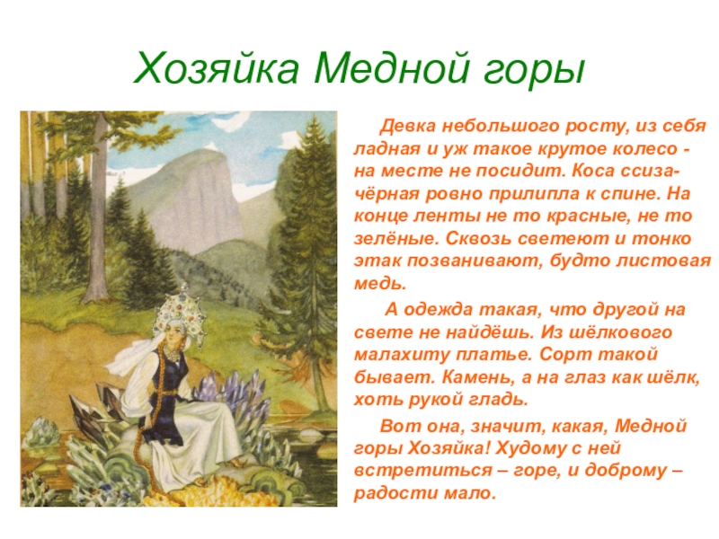 Хозяйка Медной горы Девка небольшого росту, из себя ладная и уж такое крутое колесо - на месте не посидит. Коса ссиза-чёрная ровно прилипла к спине. На конце ленты не то красные, не то зелёные.