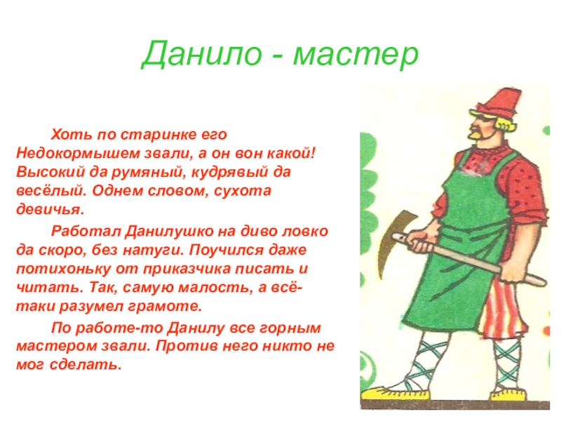 Данило - мастер		Хоть по старинке его Недокормышем звали, а он вон какой! Высокий да румяный, кудрявый да