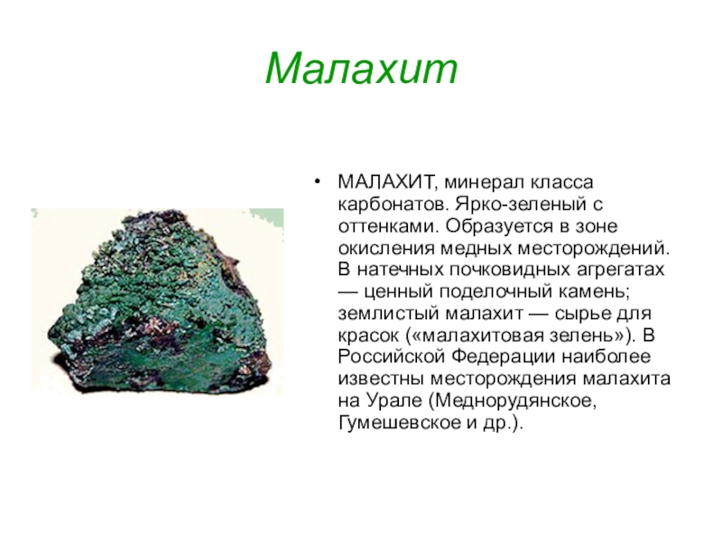 медных месторождений. В натечных почковидных агрегатах — ценный поделочный камень; землистый малахит — сырье для красок («малахитовая зелень»). В Российской Федерации наиболее известны месторождения малахита на Урале (Меднорудянское, Гумешевское и др.).
