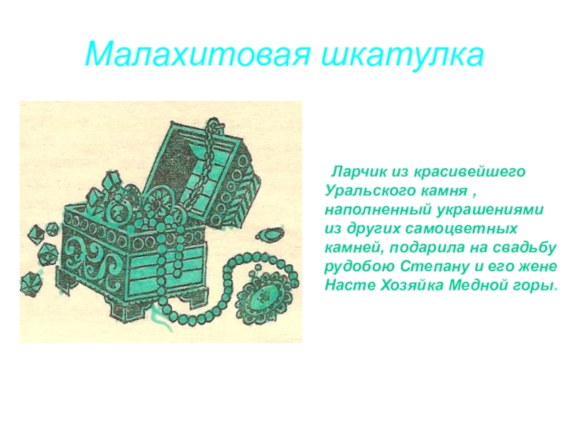 Малахитовая шкатулка	Ларчик из красивейшего Уральского камня , наполненный украшениями из других самоцветных камней, подарила на свадьбу рудобою