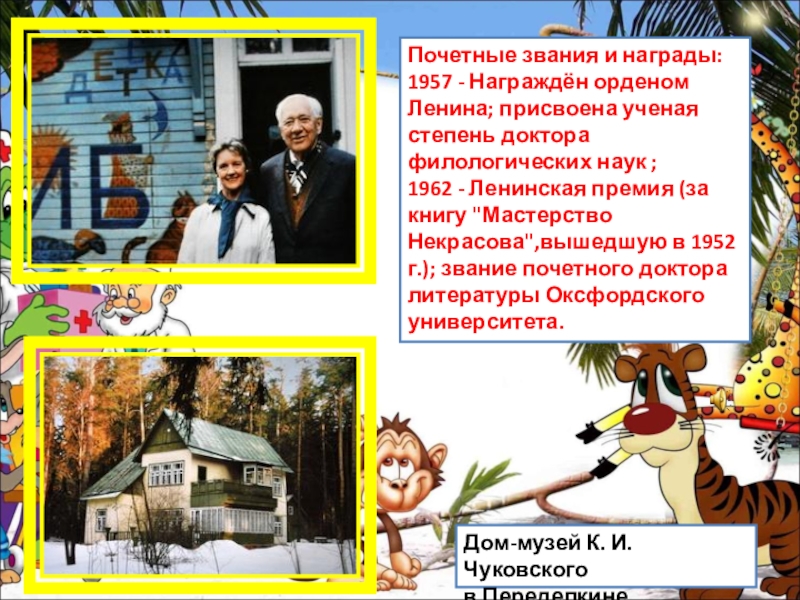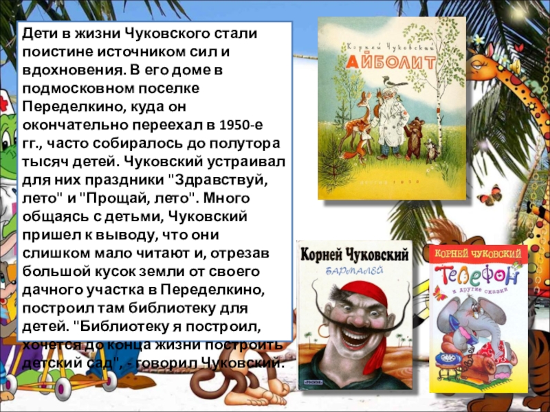 его доме в подмосковном поселке Переделкино, куда он окончательно переехал в 1950-е гг., часто собиралось до полутора тысяч детей. Чуковский устраивал для них праздники "Здравствуй, лето" и "Прощай, лето". Много общаясь с детьми, Чуковский пришел к выводу, что они слишком мало читают и, отрезав большой кусок земли от своего дачного участка в Переделкино, построил там библиотеку для детей. "Библиотеку я построил, хочется до конца жизни построить детский сад", - говорил Чуковский.