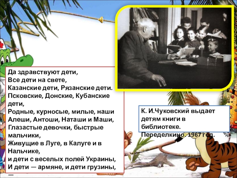 Слайд 9К. И.Чуковский выдает детям книги в библиотеке. Переделкино. 1967 год.