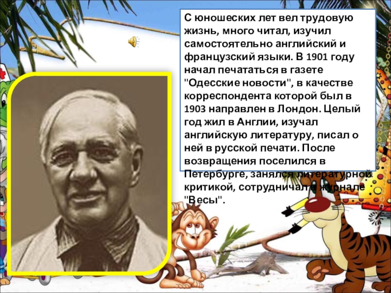 и французский языки. В 1901 году начал печататься в газете "Одесские новости", в качестве корреспондента которой был в 1903 направлен в Лондон. Целый год жил в Англии, изучал английскую литературу, писал о ней в русской печати. После возвращения поселился в Петербурге, занялся литературной критикой, сотрудничал в журнале "Весы".