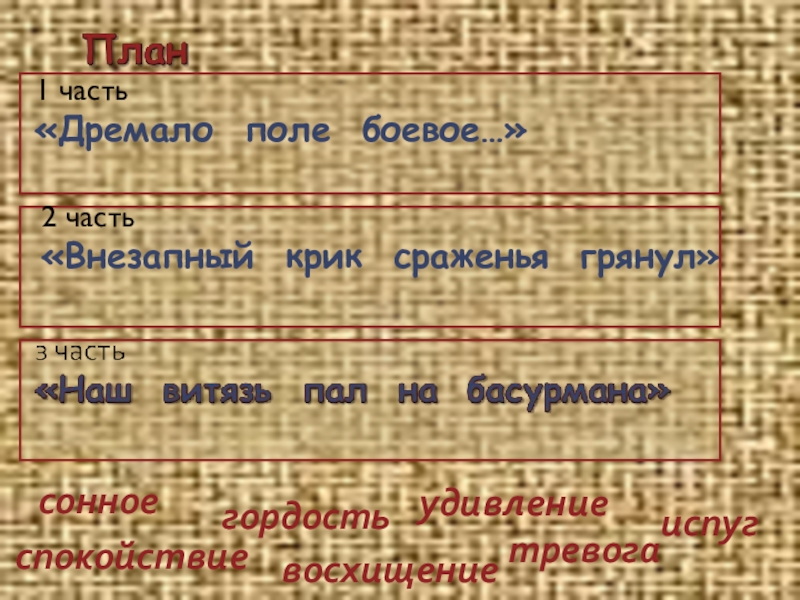 испуг1 часть«Дремало поле боевое…»2 часть«Внезапный крик сраженья грянул»сонноегордостьвосхищениеудивлениетревогаспокойствие