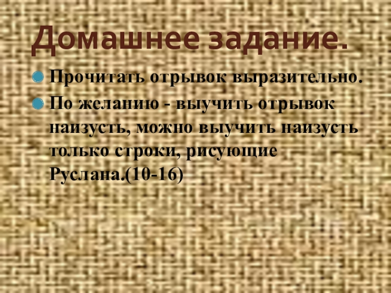 Прочитать отрывок выразительно.По желанию - выучить отрывок наизусть, можно выучить наизусть только строки, рисующие Руслана.(10-16)Домашнее задание.