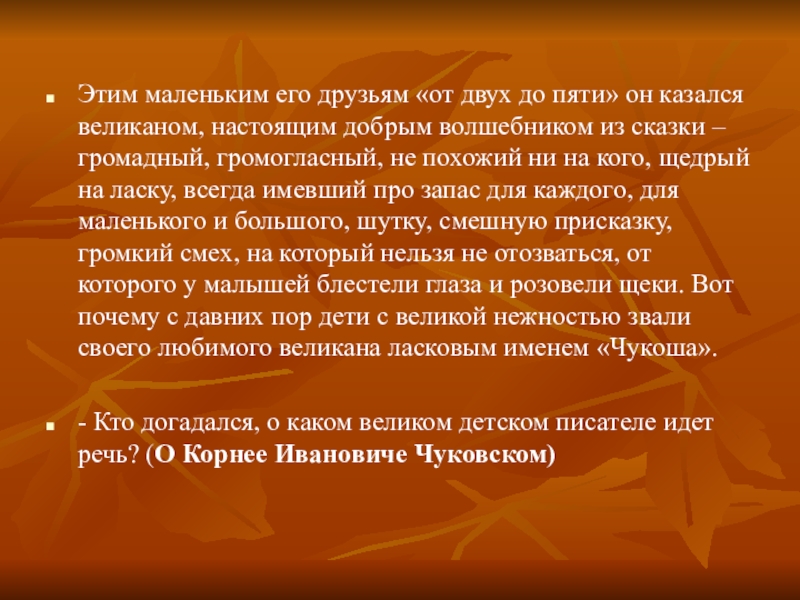 Слайд 4Этим маленьким его друзьям «от двух до пяти» он казался великаном,