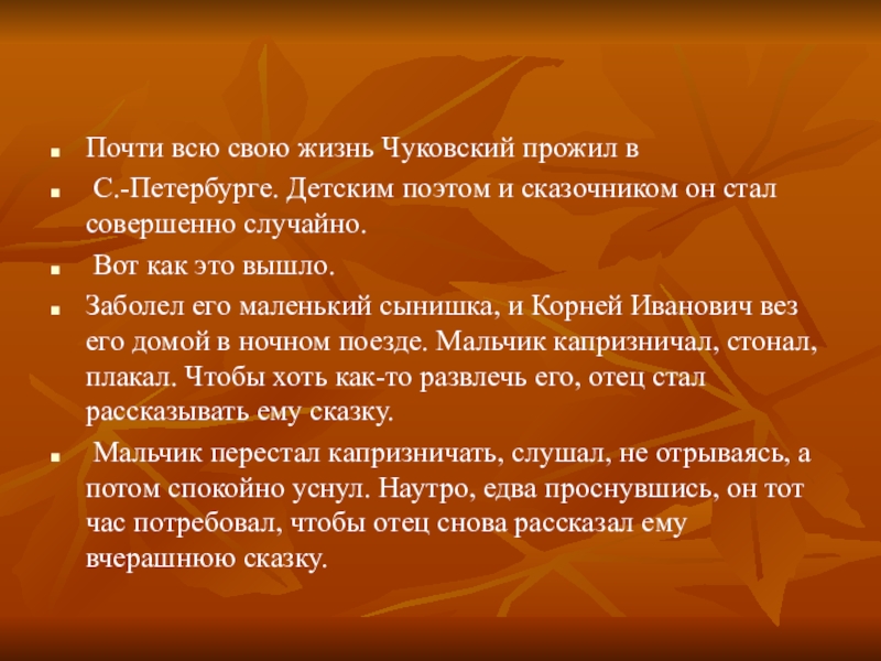 Заболел его маленький сынишка, и Корней Иванович вез его домой в ночном поезде. Мальчик капризничал, стонал, плакал. Чтобы хоть как-то развлечь его, отец стал рассказывать ему сказку.