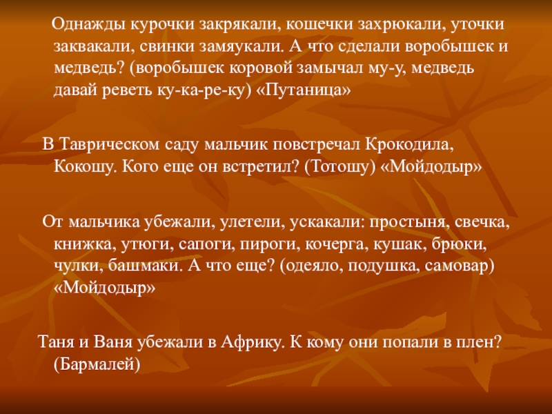 Слайд 17 Однажды курочки закрякали, кошечки захрюкали, уточки заквакали, свинки замяукали.