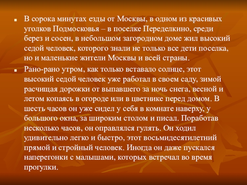 Подмосковья – в поселке Переделкино, среди берез и сосен, в небольшом загородном доме жил высокий седой человек, которого знали не только все дети поселка, но и маленькие жители Москвы и всей страны.