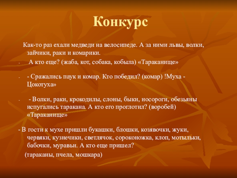 - Волки, раки, крокодилы, слоны, быки, носороги, обезьяны испугались таракана. А кто его проглотил? (воробей) «Тараканище»