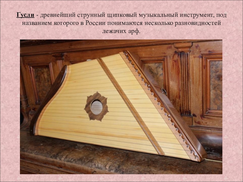 Гусли - древнейший струнный щипковый музыкальный инструмент, под названием которого в России понимаются несколько разновидностей лежачих арф.