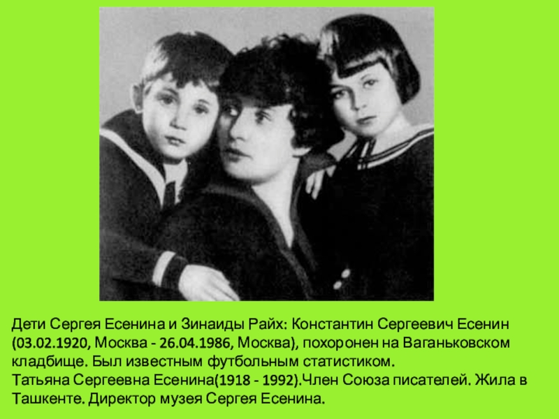 Слайд 11Дети Сергея Есенина и Зинаиды Райх: Константин Сергеевич Есенин (03.02.1920, Москва