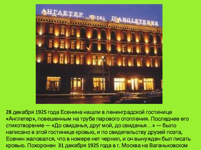 на трубе парового отопления. Последнее его стихотворение — «До свиданья, друг мой, до свиданья…» — было написано в этой гостинице кровью, и по свидетельству друзей поэта, Есенин жаловался, что в номере нет чернил, и он вынужден был писать кровью. Похоронен 31 декабря 1925 года в г. Москва на Ваганьковском кладбище.