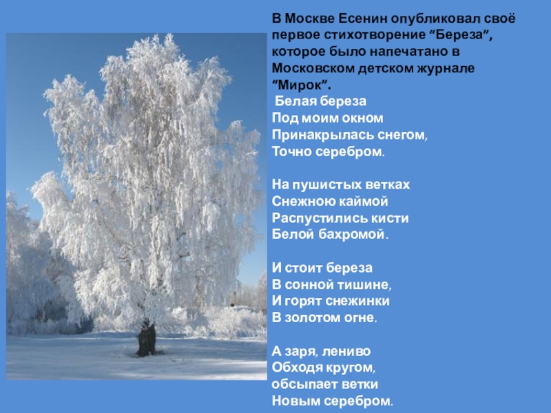 Слайд 7В Москве Есенин опубликовал своё первое стихотворение “Береза”, которое было напечатано