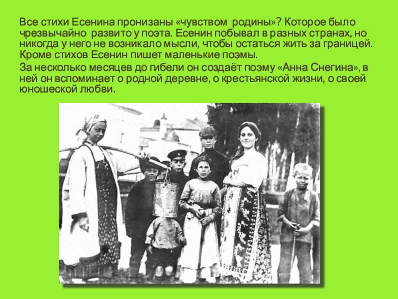 За несколько месяцев до гибели он создаёт поэму «Анна Снегина», в ней он вспоминает о родной деревне, о крестьянской жизни, о своей юношеской любви.