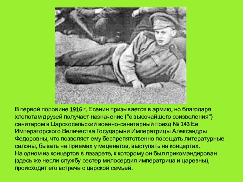 Слайд 9В первой половине 1916 г. Есенин призывается в армию, но благодаря