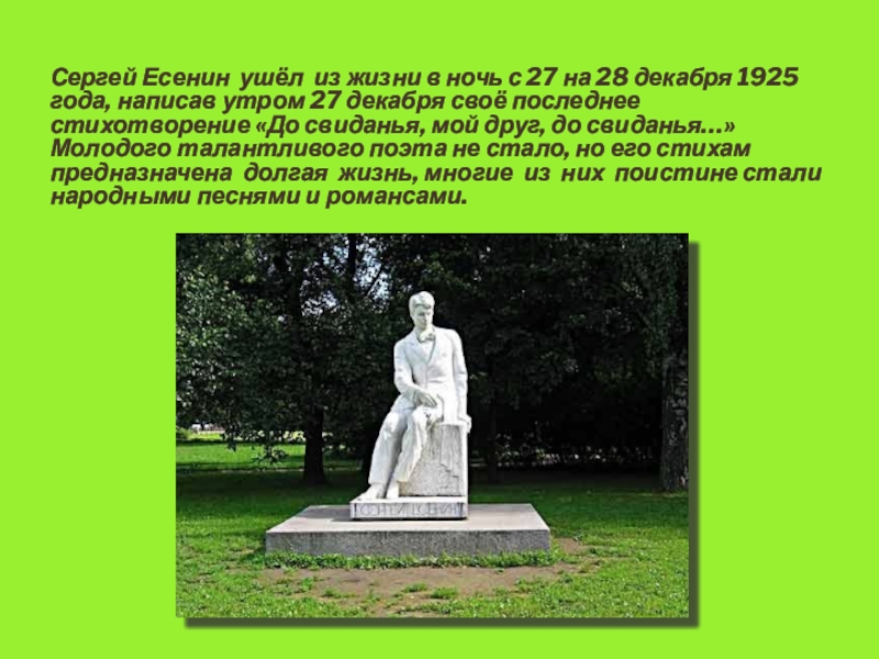 декабря 1925 года, написав утром 27 декабря своё последнее стихотворение «До свиданья, мой друг, до свиданья…» Молодого талантливого поэта не стало, но его стихам предназначена долгая жизнь, многие из них поистине стали народными песнями и романсами.