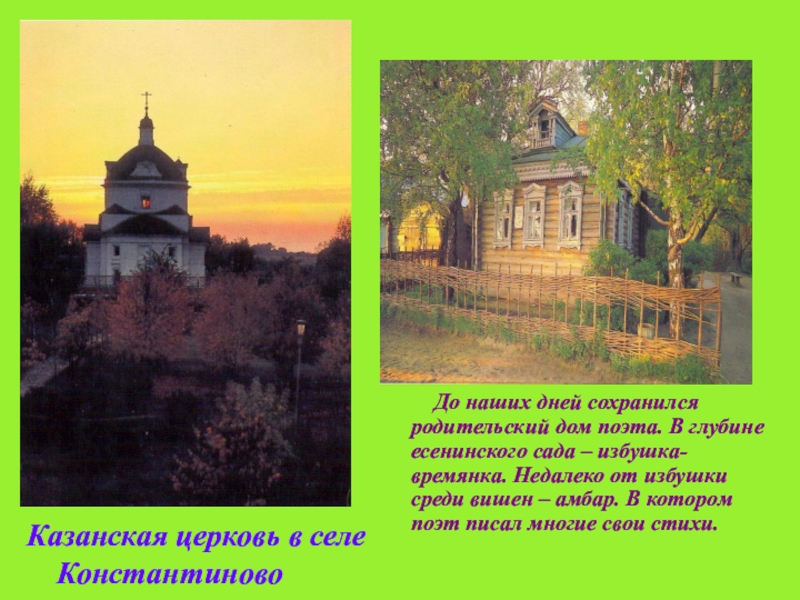 наших дней сохранился родительский дом поэта. В глубине есенинского сада – избушка- времянка. Недалеко от избушки среди вишен – амбар. В котором поэт писал многие свои стихи.