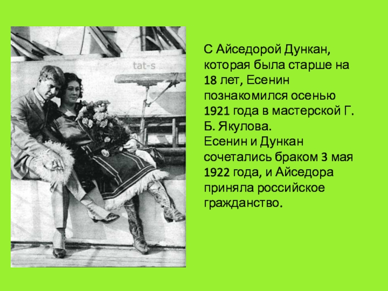 Слайд 12С Айседорой Дункан, которая была старше на 18 лет, Есенин познакомился