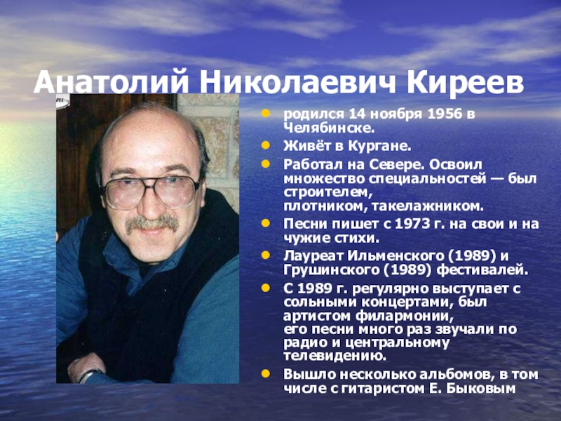 Анатолий Николаевич Киреевродился 14 ноября 1956 в Челябинске.Живёт в Кургане.Работал на Севере. Освоил множество специальностей — был