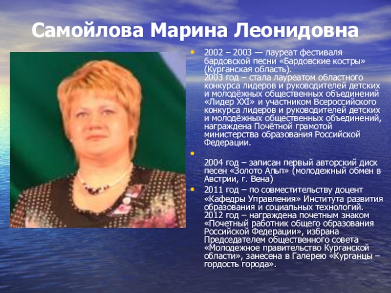 Самойлова Марина Леонидовна 2002 – 2003 — лауреат фестиваля бардовской песни «Бардовские костры» (Курганская область). 2003 год