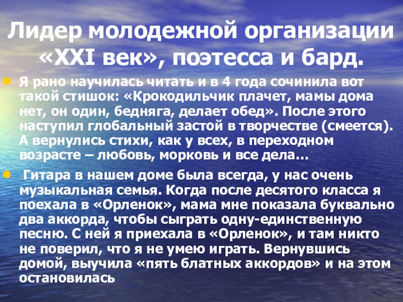 Лидер молодежной организации «XXI век», поэтесса и бард. Я рано научилась читать и в 4 года сочинила