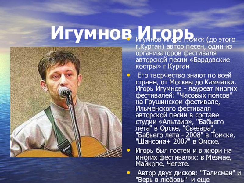 Игумнов Игорь Игумнов Игорь г.Омск (до этого г.Курган) автор песен, один из организаторов фестиваля авторской песни «Бардовские
