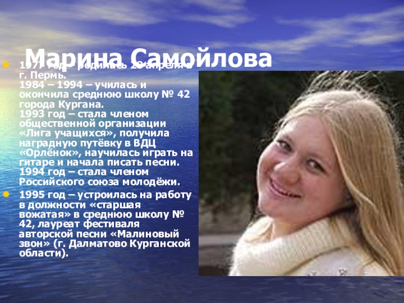 Марина Самойлова1977 год – родилась 28 апреля в г. Пермь. 1984 – 1994 – училась и окончила
