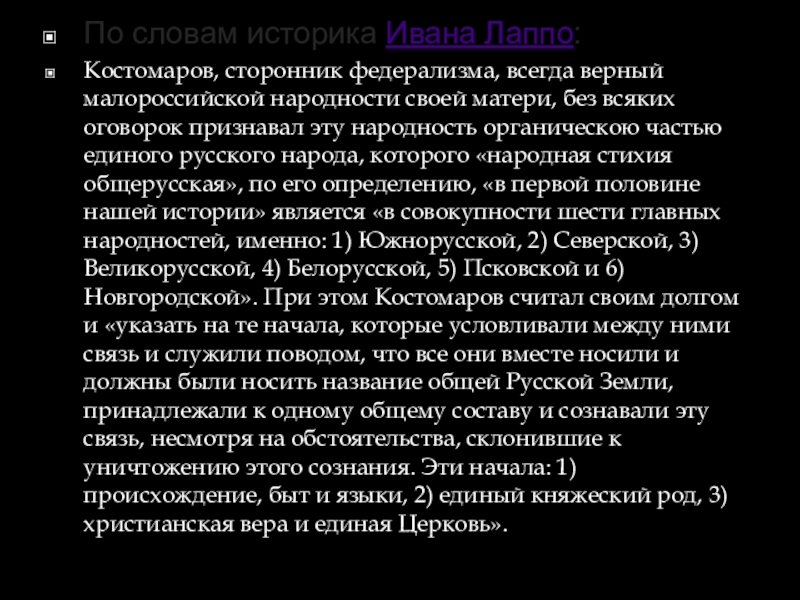 матери, без всяких оговорок признавал эту народность органическою частью единого русского народа, которого «народная стихия общерусская», по его определению, «в первой половине нашей истории» является «в совокупности шести главных народностей, именно: 1) Южнорусской, 2) Северской, 3) Великорусской, 4) Белорусской, 5) Псковской и 6) Новгородской». При этом Костомаров считал своим долгом и «указать на те начала, которые условливали между ними связь и служили поводом, что все они вместе носили и должны были носить название общей Русской Земли, принадлежали к одному общему составу и сознавали эту связь, несмотря на обстоятельства, склонившие к уничтожению этого сознания. Эти начала: 1) происхождение, быт и языки, 2) единый княжеский род, 3) христианская вера и единая Церковь».