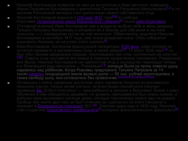 Слайд 3Николай Костомаров появился на свет до вступления в брак местного помещика
